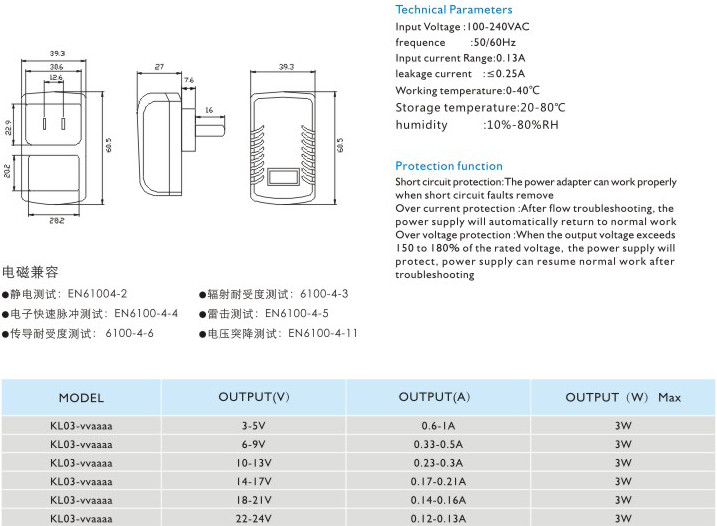 頻率:50/60Hz 輸入電流:0.13A 漏電電流:≤0.25A 工作溫度:0-40℃ 貯藏溫度:-20-80℃ 濕度:10%-80%RH 短路保護: 電源適配器在短路解除時能正常工作恢復(fù) 過流保護:過流故障排除后,電源將自動恢復(fù)正常工作 過壓保護:當(dāng)輸出電壓超過額定電壓的150-180%時,電源將保護,故障排除后電源能恢復(fù)正常工作" />