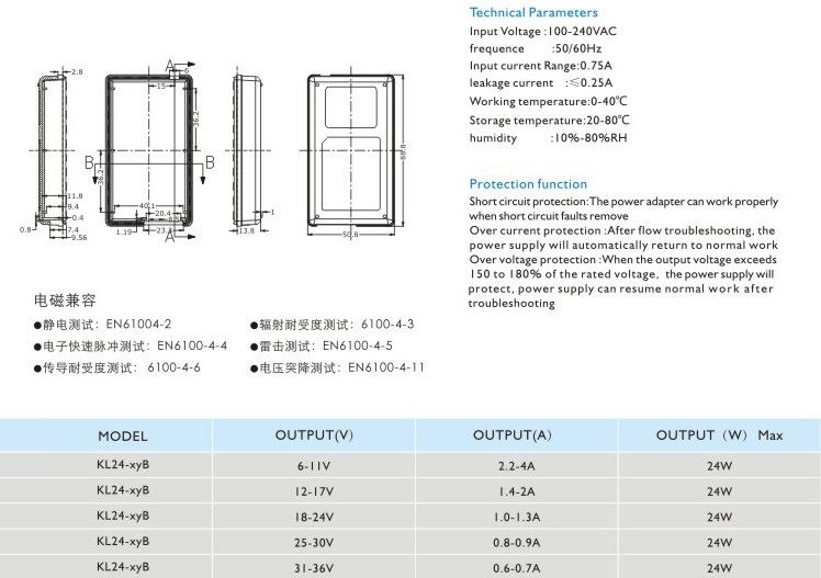 過流保護:過流故障排除后,電源將自動恢復(fù)正常工作 過壓保護:當(dāng)輸出電壓超過額定電壓的150~180%時,電源將保護,故障排除后電源能恢復(fù)正常工作 輸入電壓:100-240VAC 頻率:50/60Hz 輸入電流:0.75A 漏電電流:<0.25A 工作溫度:0-40℃ 貯藏溫度:-20-80℃ 濕度:10%-80%RH" />